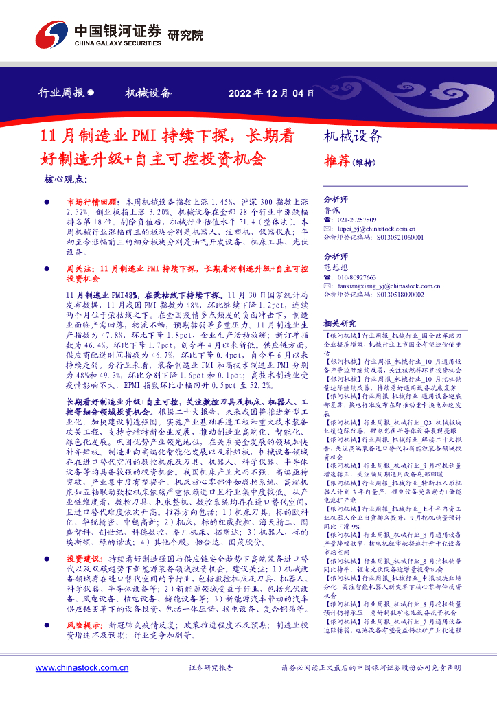 中国银河:机械设备行业周报:11月制造业PMI持续下探,长期看好制造升级+自主可控投资机会.pdf