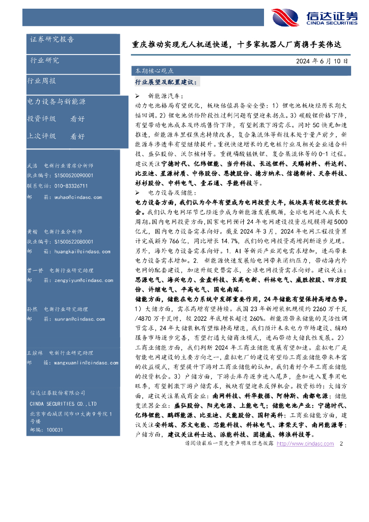 信达证券:电新周报:重庆推动实现无人机送快递,十多家机器人厂商携手英伟达电力设备与新能源.pdf