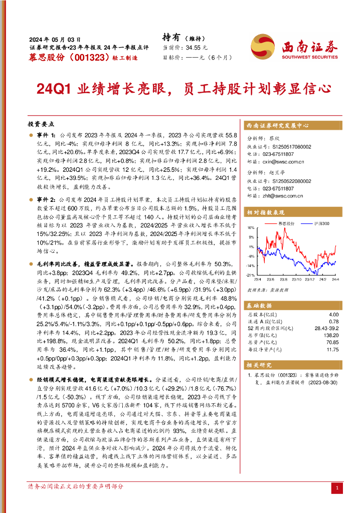西南证券:慕思股份(001323)-23年年报及24年一季报点评:24Q1业绩增长亮眼,员工持股计划彰显信心.pdf