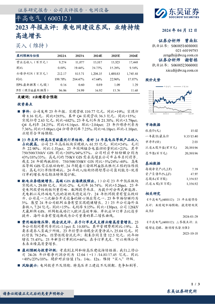 东吴证券:平高电气(600312)-2023年报点评:乘电网建设东风,业绩持续高速增长.pdf