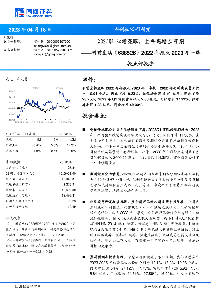 国海证券:科前生物(688526)-2022年报及2023年一季报点评报告:2023Q1业绩亮眼,全年高增长可期.pdf