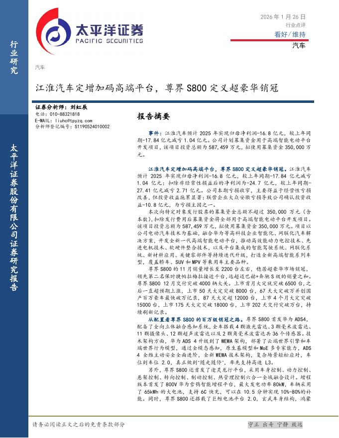 太平洋证券:汽车:江淮汽车定增加码高端平台,尊界S800定义超豪华销冠.pdf