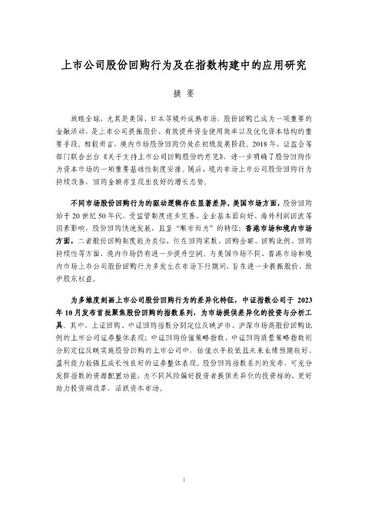 中证指数:上市公司股份回购行为及在指数构建中的应用研究报告(摘要).pdf