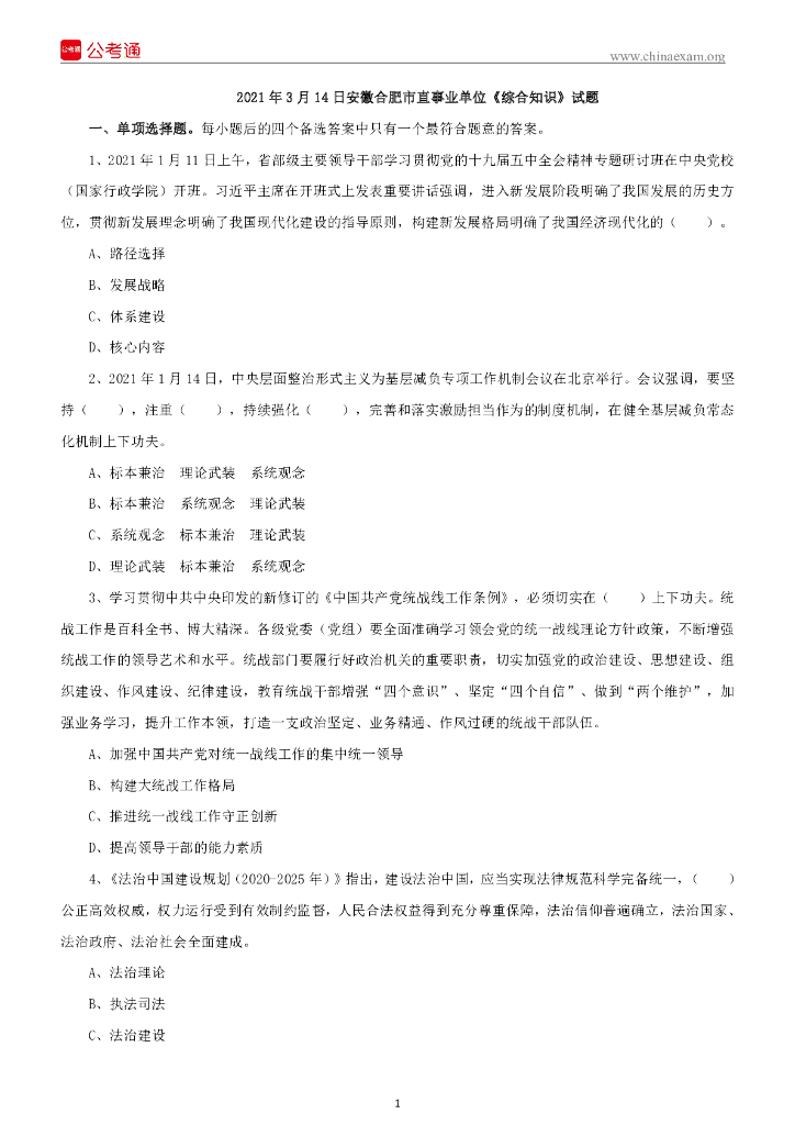 2021年3月14日安徽合肥市直事业单位《综合知识》试题.pdf