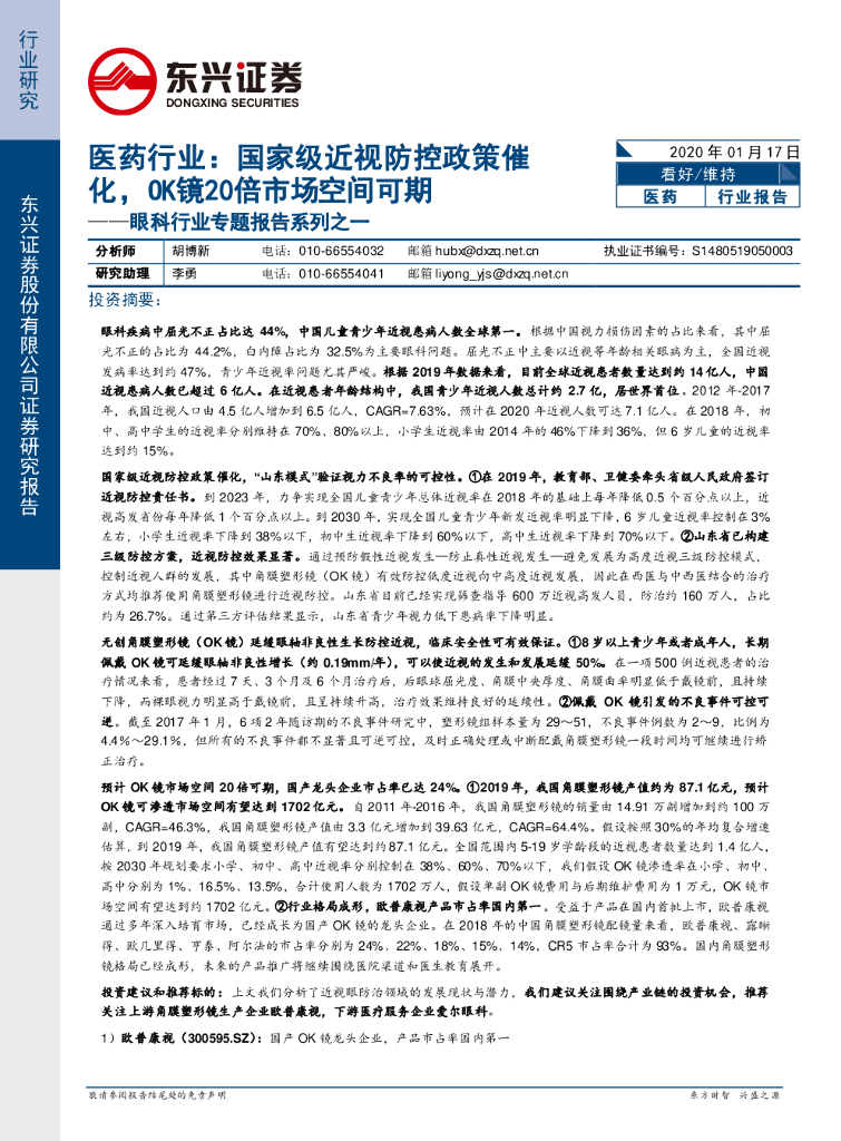 东兴证券:眼科行业专题报告系列之一:医药行业:国家级近视防控政策催化,OK镜20倍市场空间可期.pdf