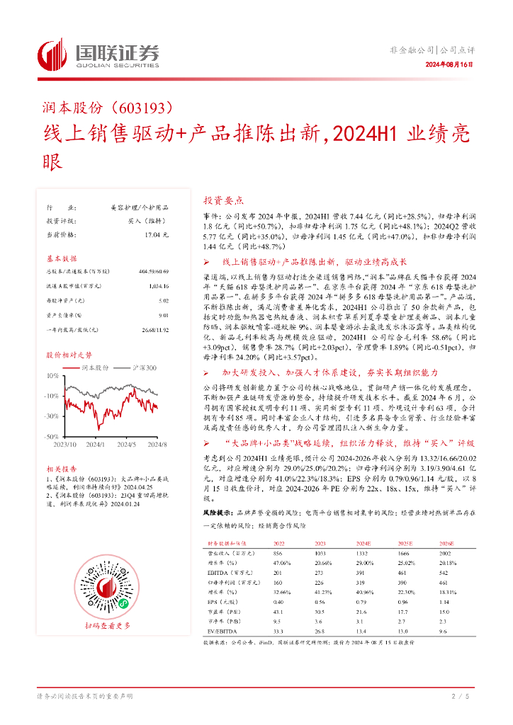 国联证券:润本股份(603193)-线上销售驱动+产品推陈出新,2024H1业绩亮眼.pdf