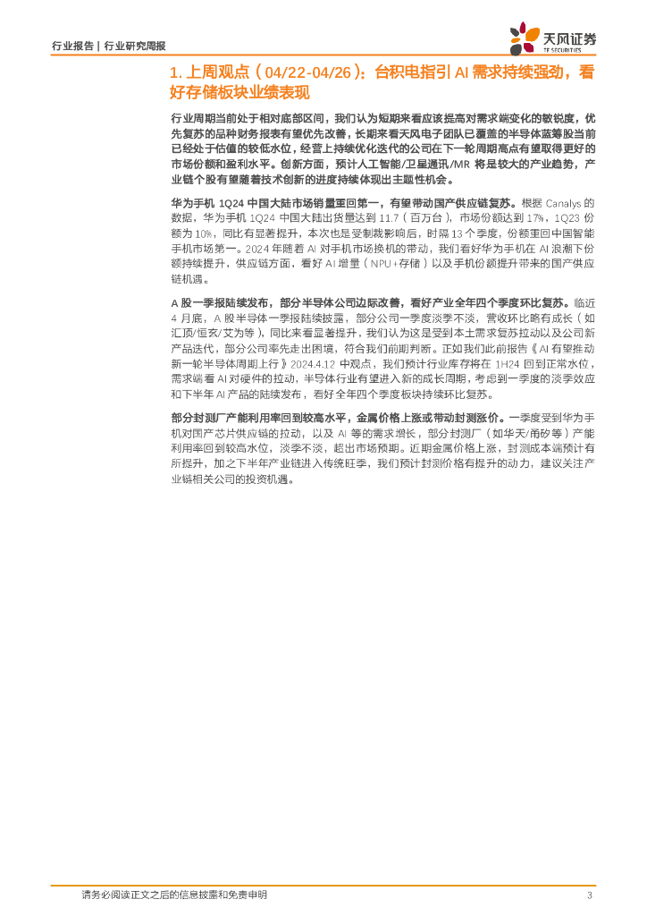 天风证券:半导体行业研究周报:华为手机1Q24中国大陆销量第一,看好半导体板块周期复苏.pdf
