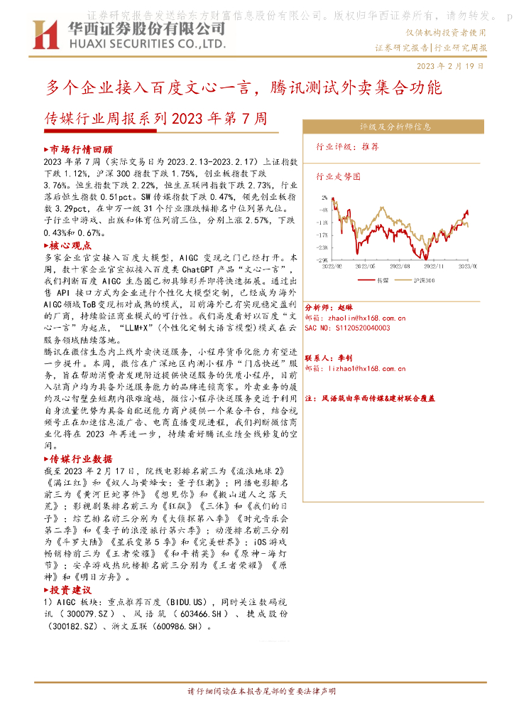 华西证券:传媒行业周报系列2023年第7周:多个企业接入百度文心一言,腾讯测试外卖集合功能.pdf