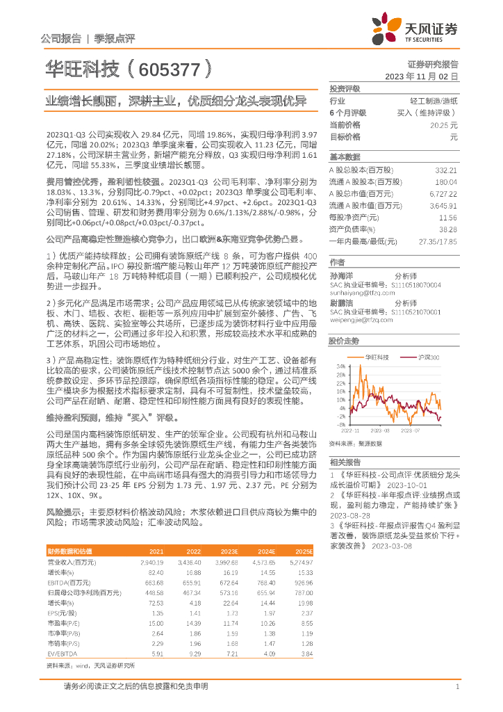 天风证券:华旺科技(605377)-业绩增长靓丽,深耕主业,优质细分龙头表现优异.pdf
