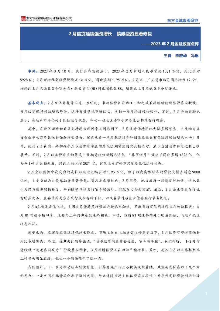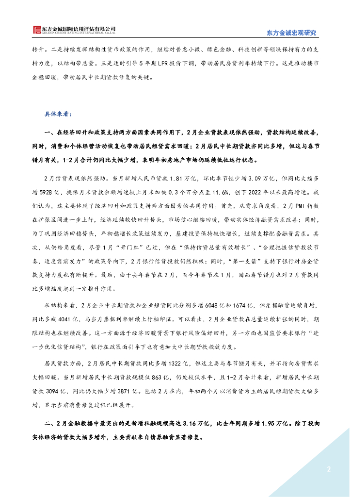 东方金诚:2月信贷延续强劲增长,债券融资显著修复-2023年2月金融数据点评.pdf