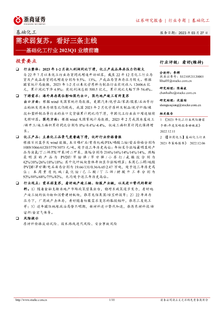 浙商证券:基础化工行业2023Q1业绩前瞻:需求弱复苏,看好三条主线.pdf