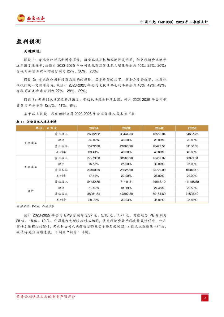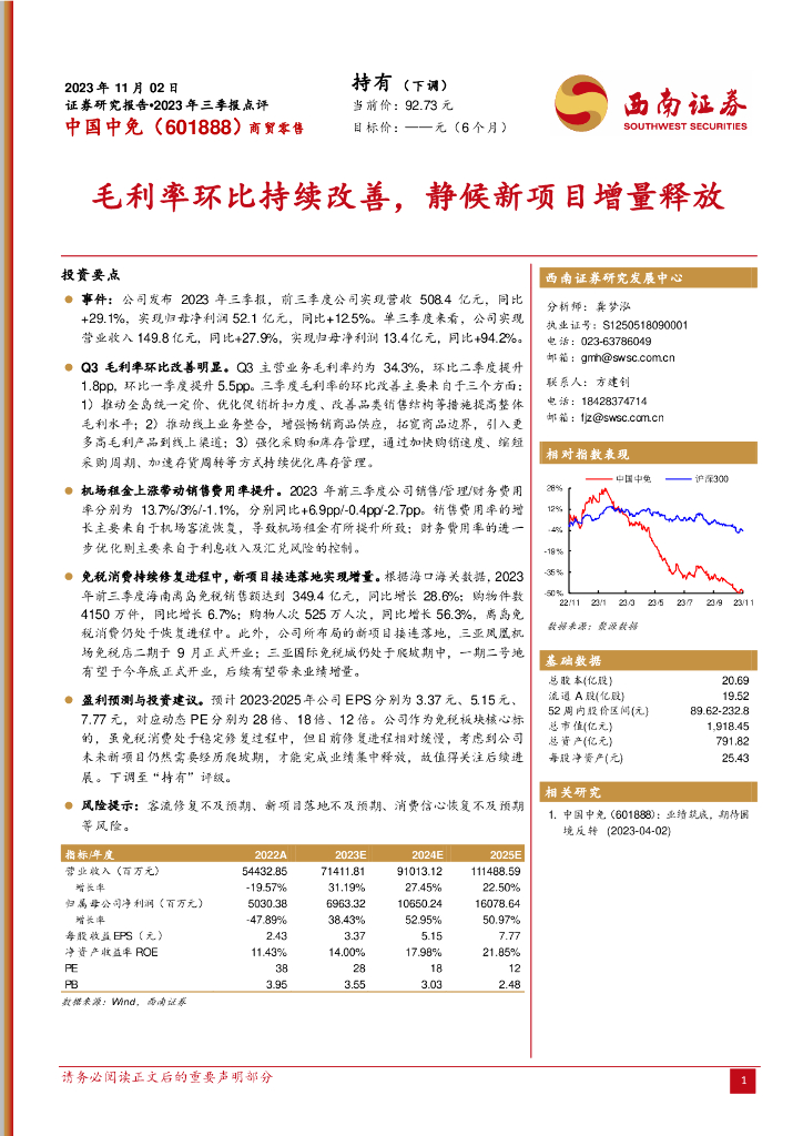 西南证券:中国中免(601888)-2023年三季报点评:毛利率环比持续改善,静候新项目增量释放.pdf