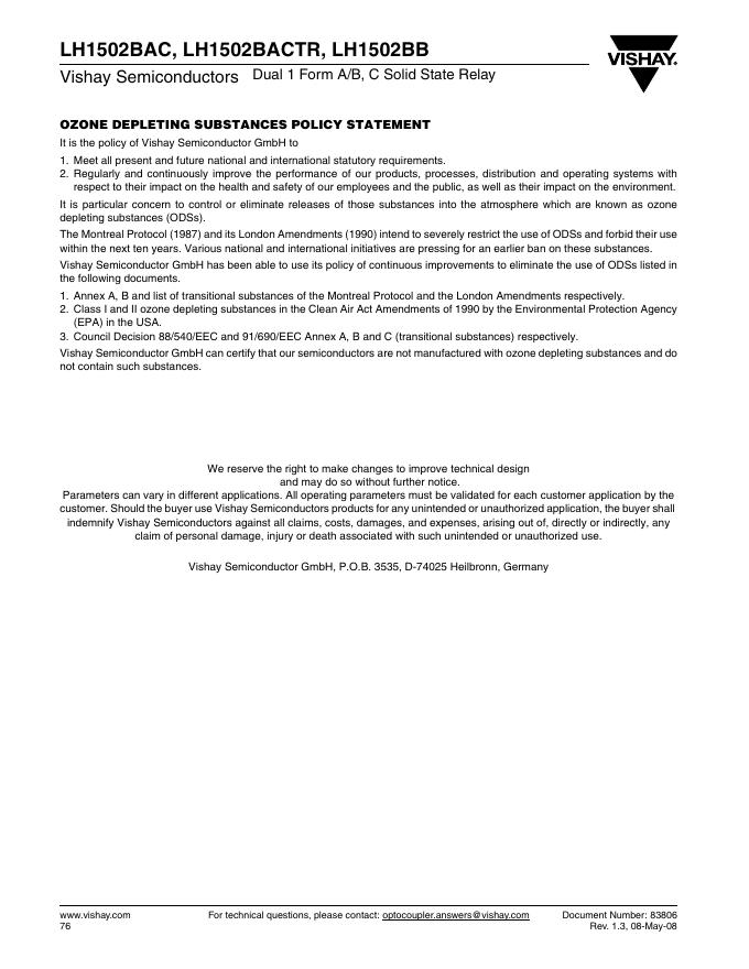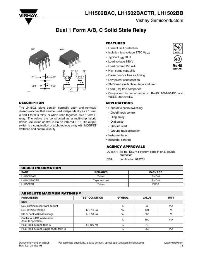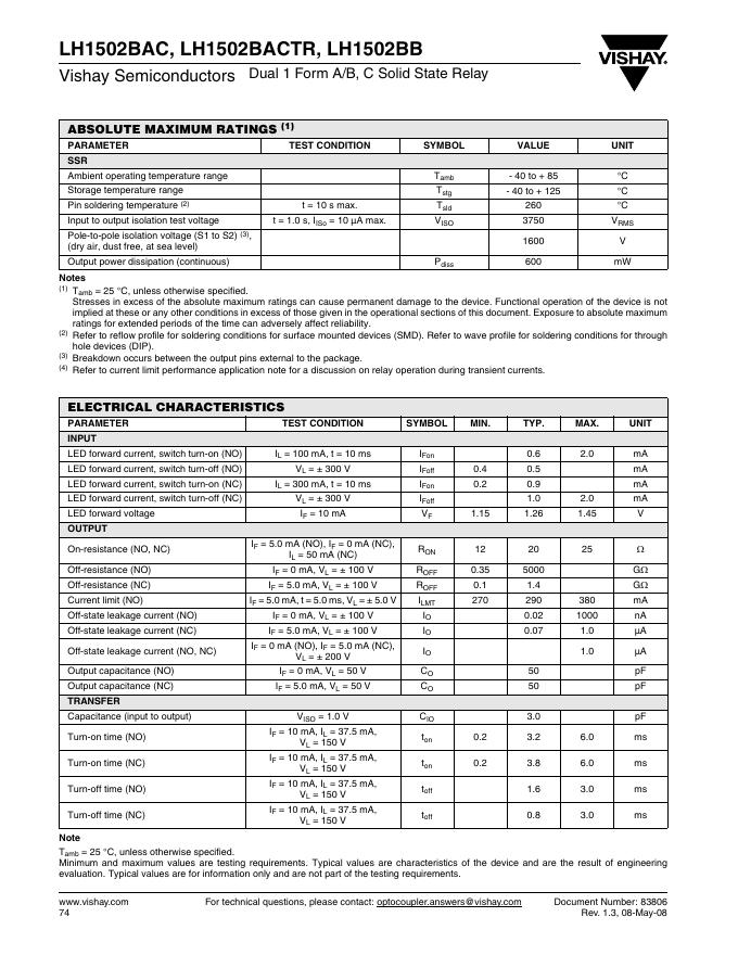 VISHAY SEMICONDUCTOR - LH1502BAC, LH1502BACTR, LH1502BB 数据手册.pdf