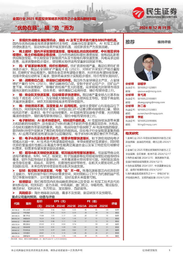 民生证券:金属行业2025年度投资策略系列报告之小金属&新材料篇:“优势在我”,顺“势”而为.pdf