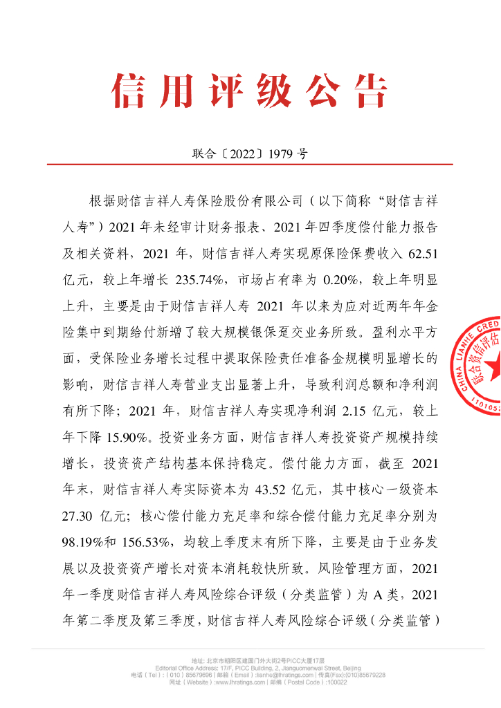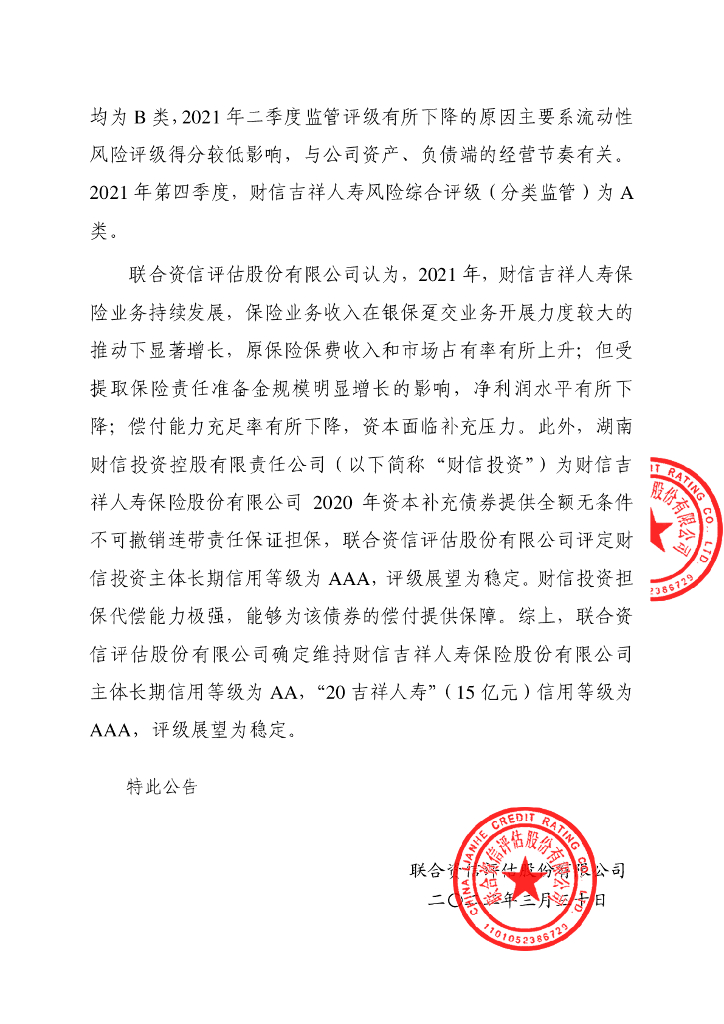 联合资信:财信吉祥人寿保险股份有限公司季度跟踪评级公告.pdf