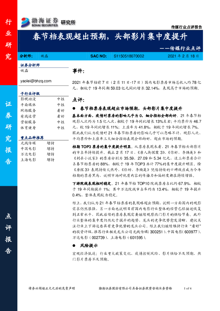 渤海证券:传媒行业点评:春节档表现超出预期,头部影片集中度提升.pdf