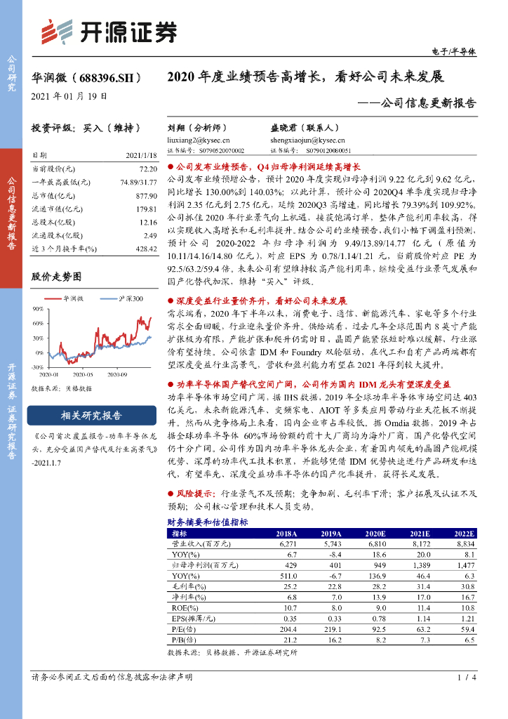 开源证券:华润微(688396)-公司信息更新报告:2020年度业绩预告高增长,看好公司未来发展.pdf