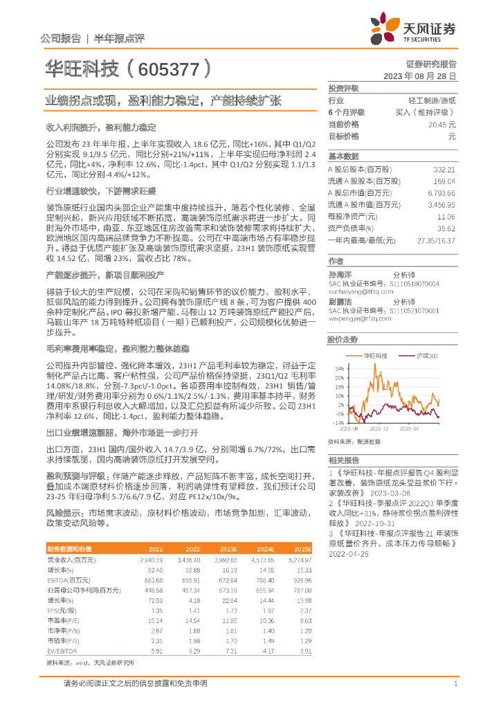 天风证券:华旺科技(605377)-业绩拐点或现,盈利能力稳定,产能持续扩张.pdf