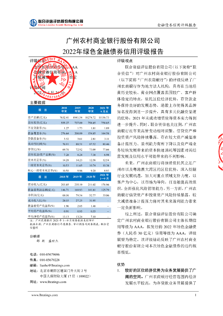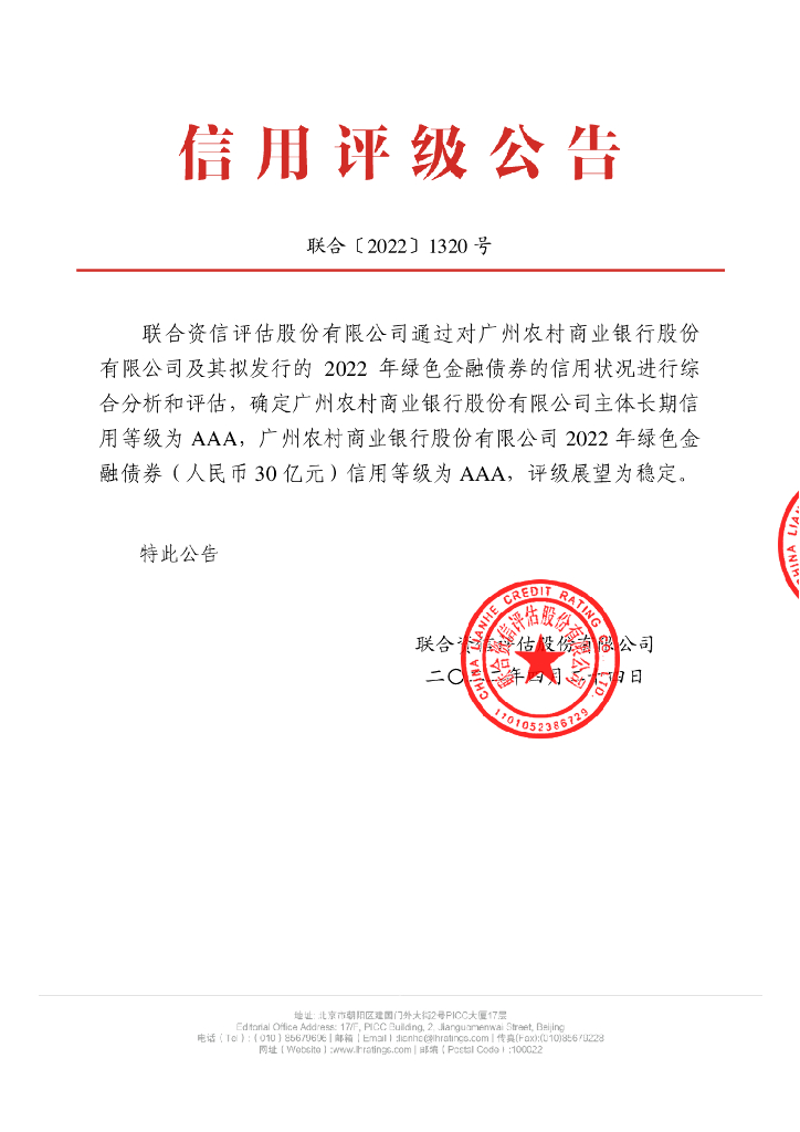 联合资信:广州农村商业银行股份有限公司2022年绿色金融债券信用评级报告及跟踪评级安排.pdf