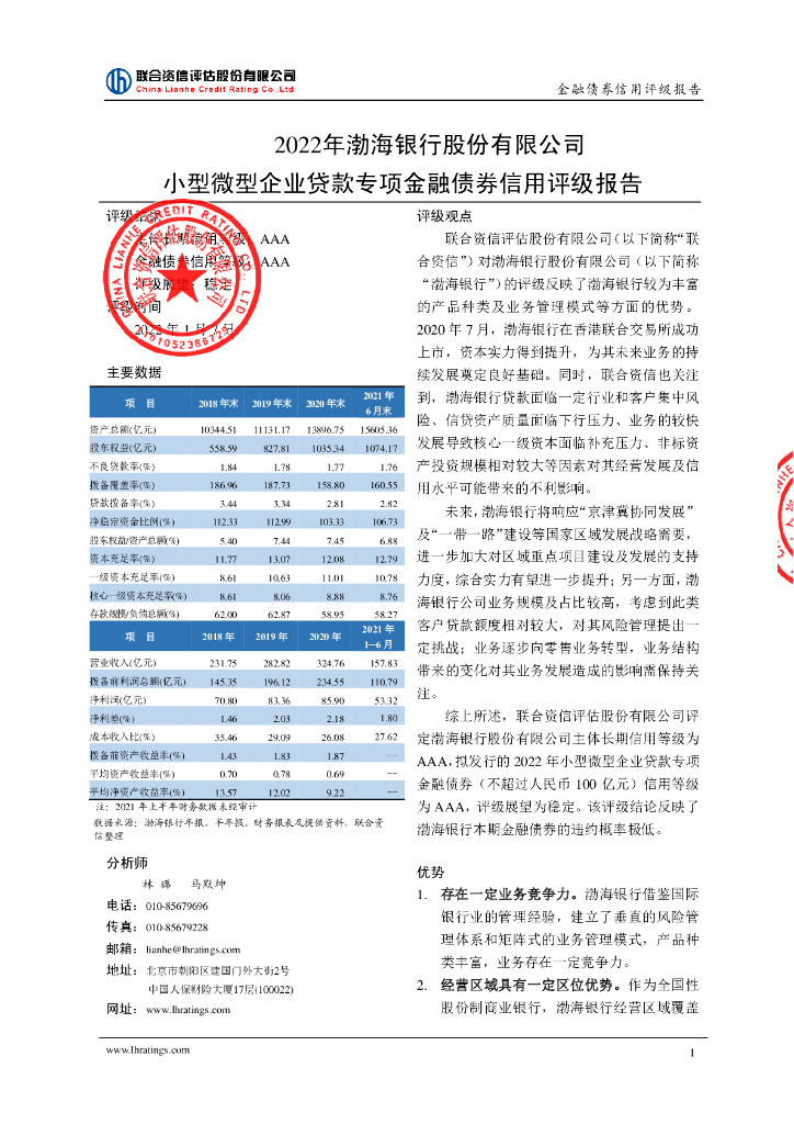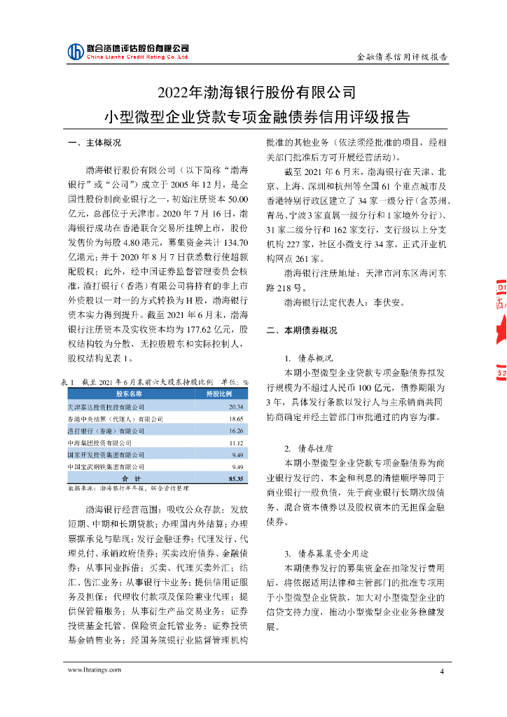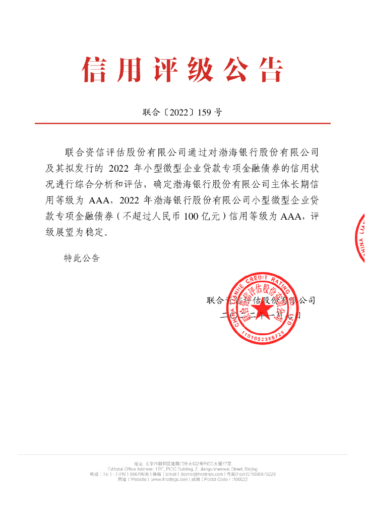 联合资信:渤海银行股份有限公司2022年小型微型企业贷款专项金融债券信用评级报告及跟踪评级安排.pdf