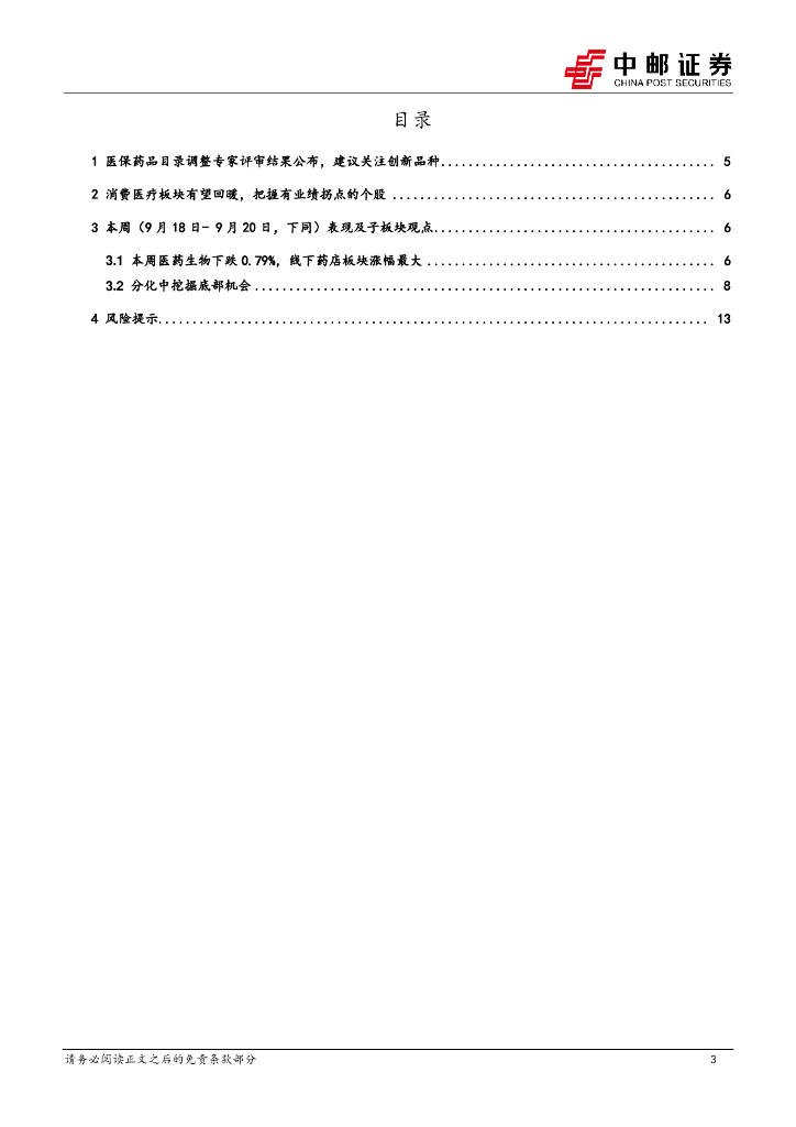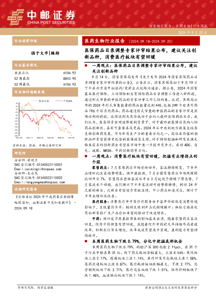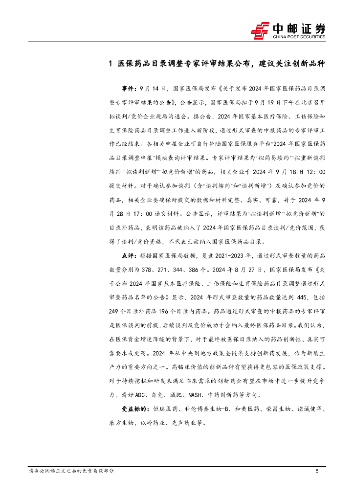中邮证券:医药生物行业报告:医保药品目录调整专家评审结果公布,建议关注创新品种,消费医疗板块有望回暖.pdf