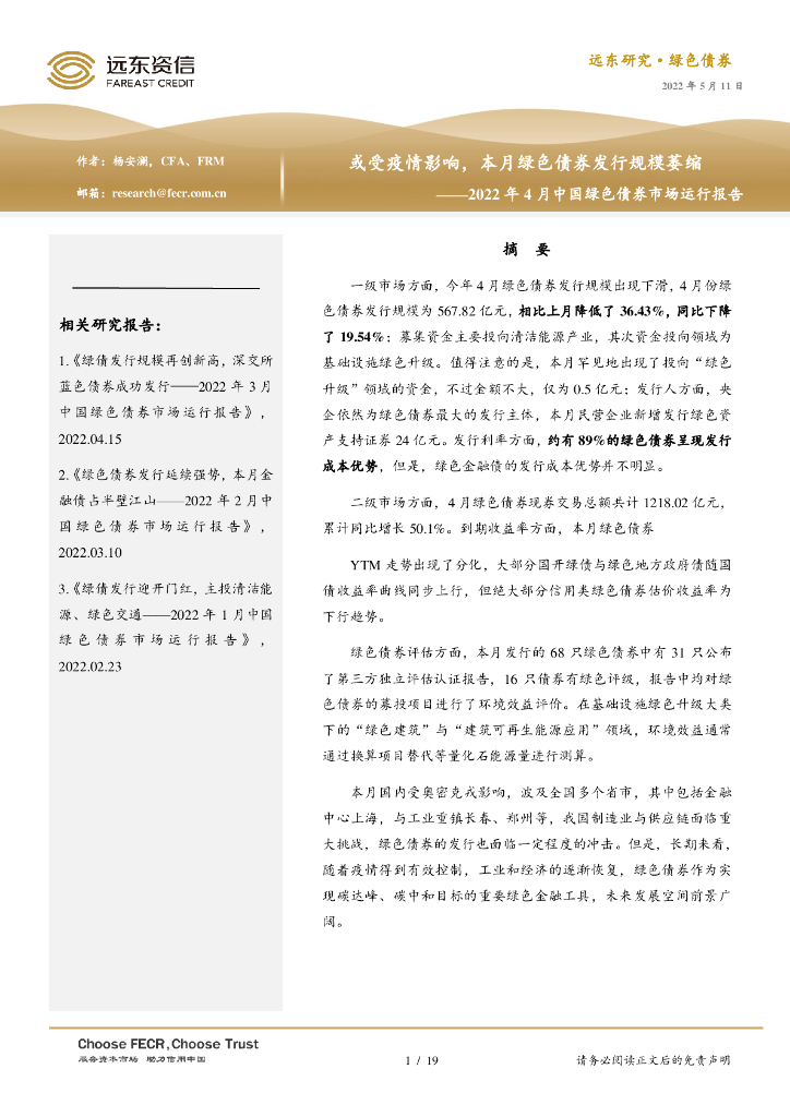 远东资信:或受疫情影响,本月绿色债券发行规模萎缩——2022年4月中国绿色债券市场运行报告.pdf