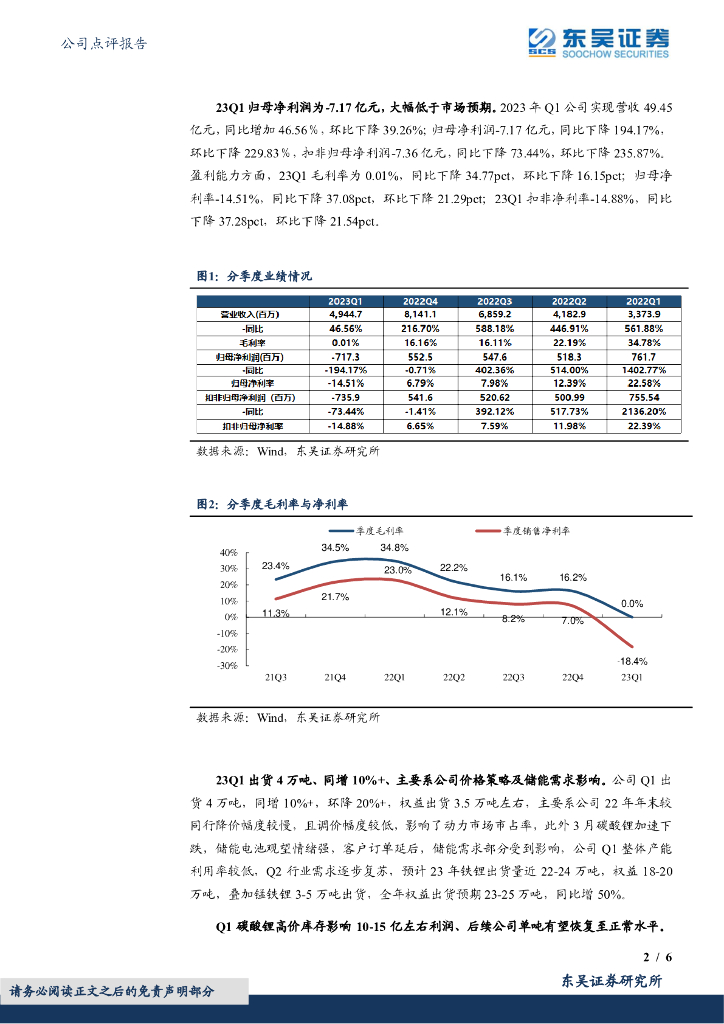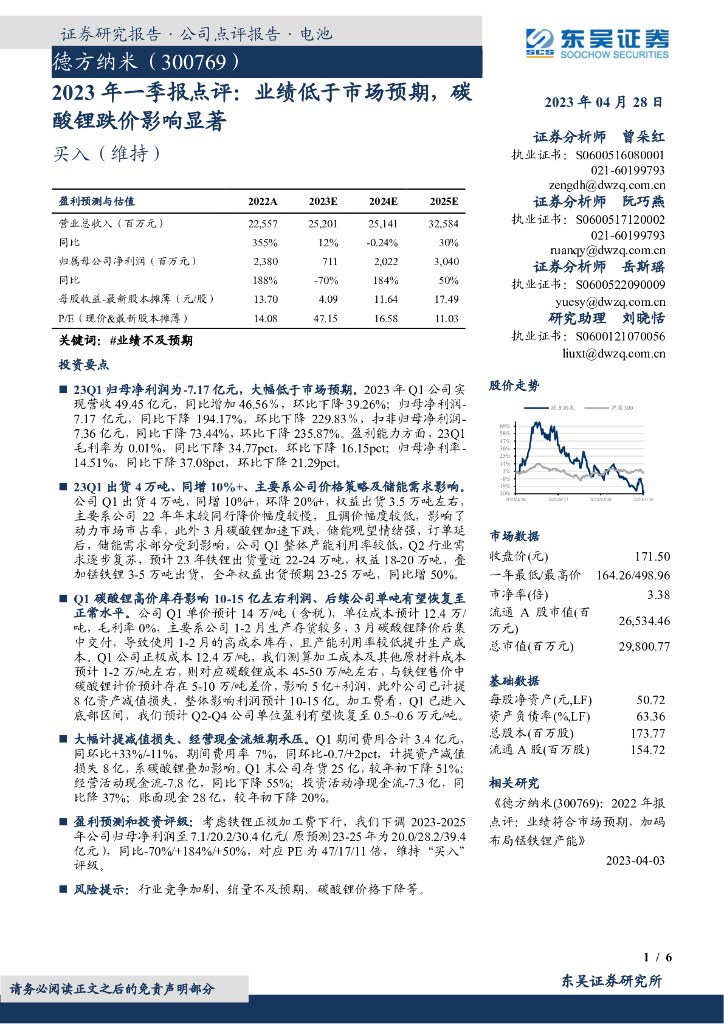 东吴证券:德方纳米(300769)-2023年一季报点评:业绩低于市场预期,碳酸锂跌价影响显著.pdf