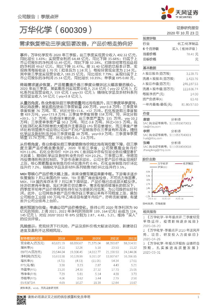 天风证券:万华化学(600309)-需求恢复带动三季度显著改善,产品价格走势向好.pdf