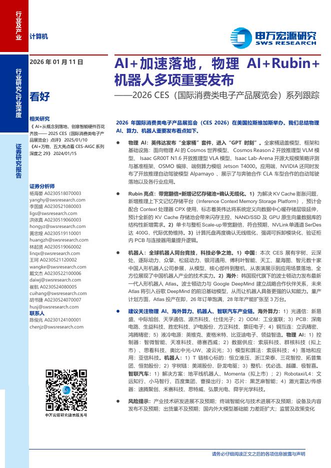 申万宏源证券:2026CES(国际消费类电子产品展览会)系列跟踪:AI+加速落地,物理AI+Rubin+机器人多项重要发布.pdf