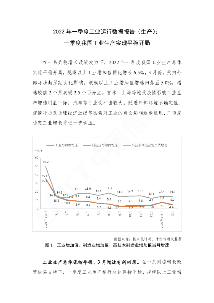 中国信通院:2022年一季度工业运行数据报告(生产):一季度我国工业生产实现平稳开局.pdf