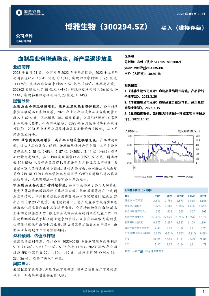 国金证券:博雅生物(300294)-血制品业务增速稳定,新产品逐步放量.pdf