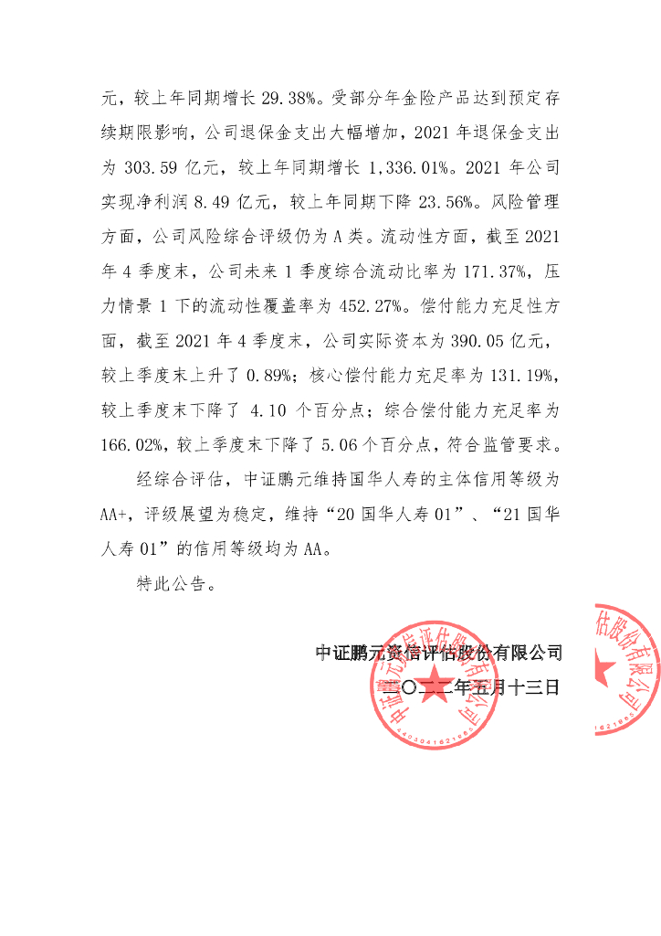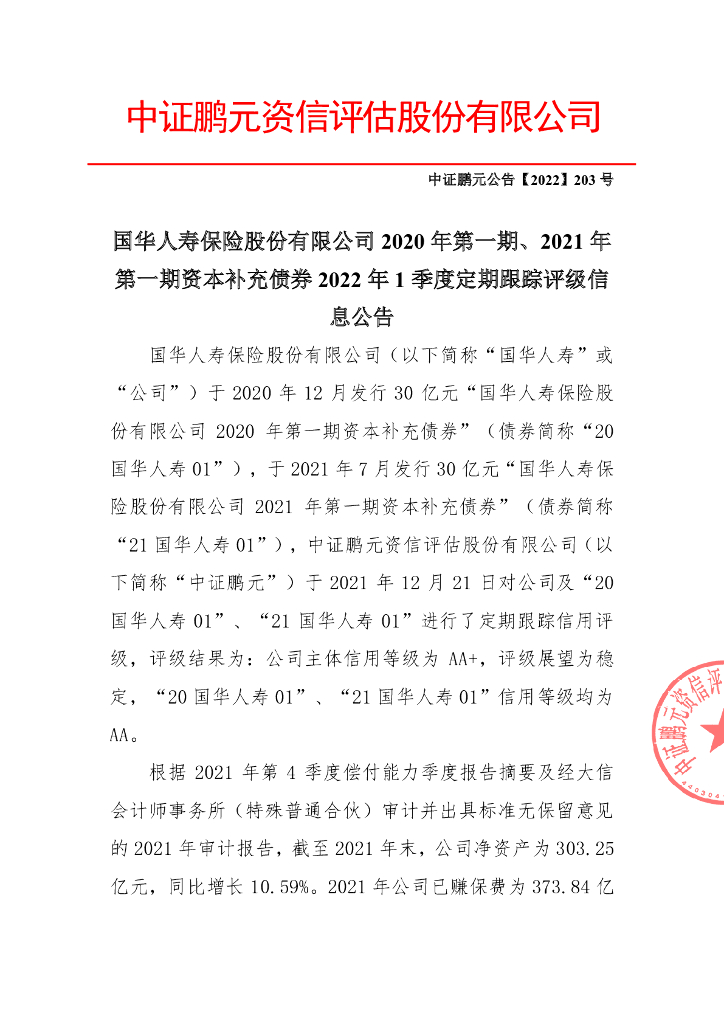 鹏元:国华人寿保险股份有限公司2020年第一期、2021年第一期资本补充债券2022年1季度定期跟踪评级信息公告.pdf
