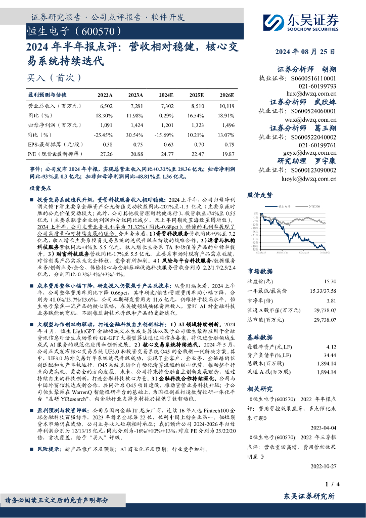 东吴证券:恒生电子(600570)-2024年半年报点评:营收相对稳健,核心交易系统持续迭代.pdf