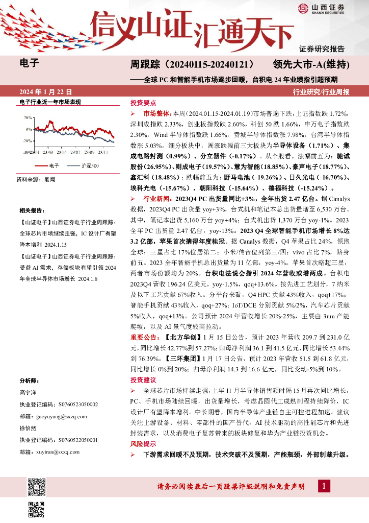 山西证券:电子周跟踪:全球PC和智能手机市场逐步回暖,台积电24年业绩指引超预期.pdf