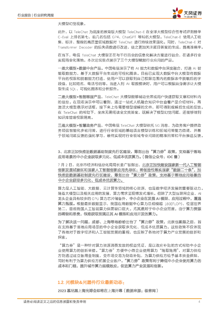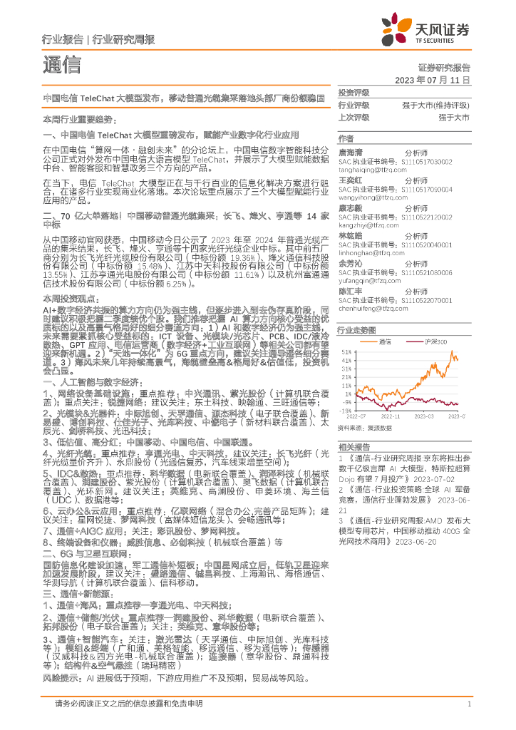 天风证券:通信行业研究周报:中国电信TeleChat大模型发布,移动普通光缆集采落地头部厂商份额稳固.pdf