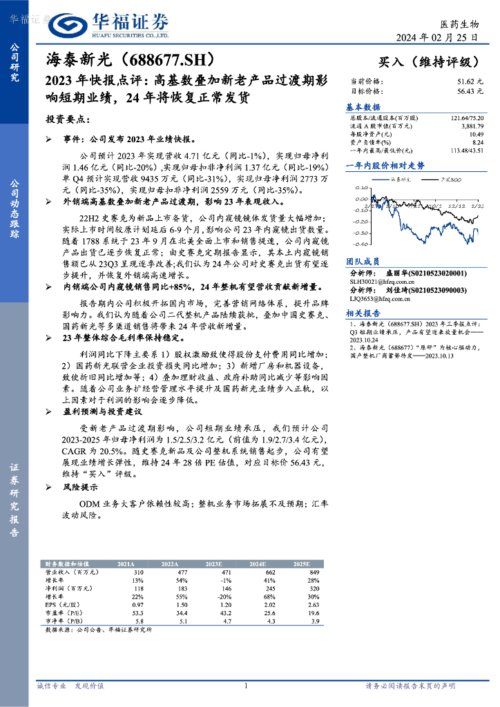 华福证券:海泰新光(688677)-2023年快报点评:高基数叠加新老产品过渡期影响短期业绩,24年将恢复正常发货.pdf