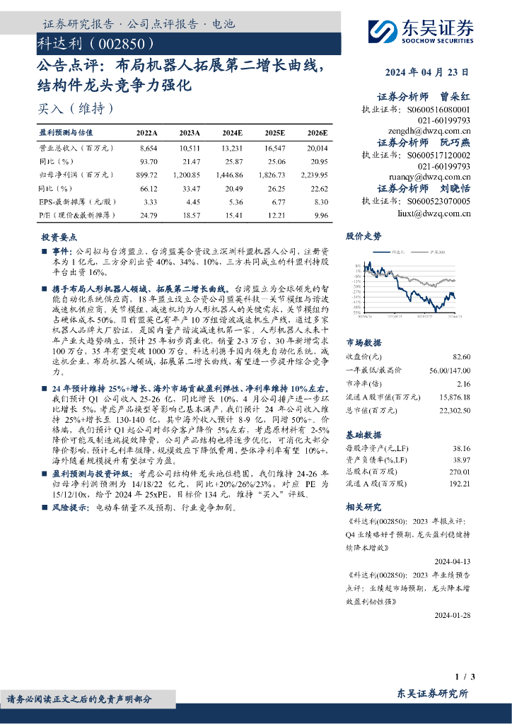 东吴证券:科达利(002850)-公告点评:布局机器人拓展第二增长曲线,结构件龙头竞争力强化.pdf
