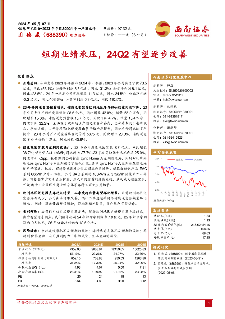 西南证券:固德威(688390)-短期业绩承压,24Q2有望逐步改善.pdf