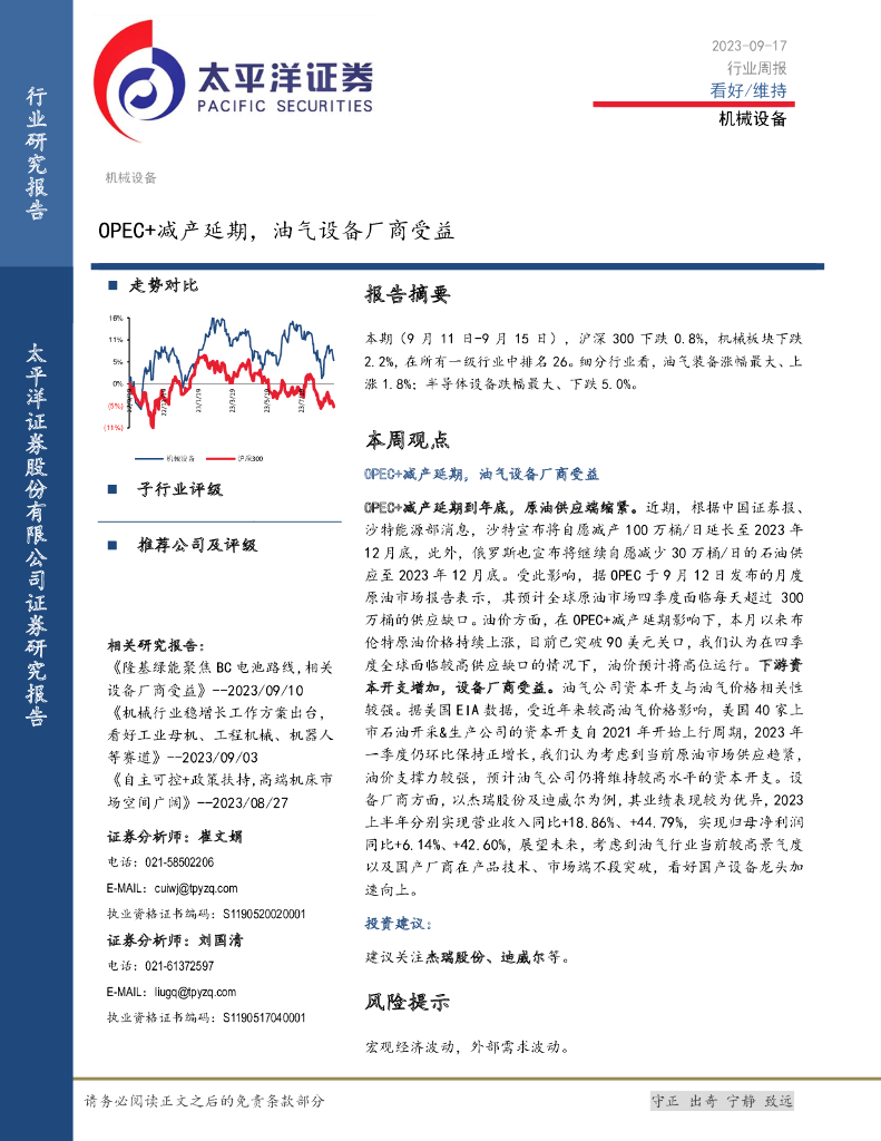 太平洋证券:机械设备行业周报:OPEC+减产延期,油气设备厂商受益.pdf