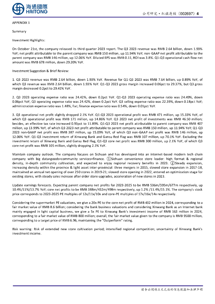 海通国际:红旗连锁(002697)-公司季报点评:3Q23控费提效,高基数致主业净利略降2%.pdf