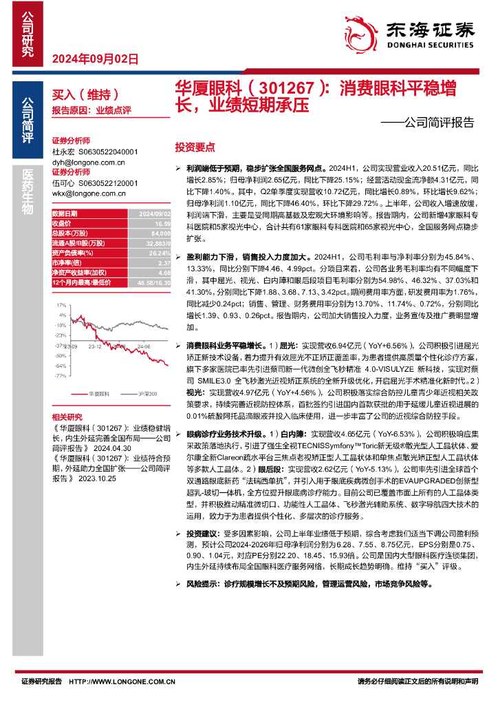 东海证券:华厦眼科(301267)-公司简评报告:消费眼科平稳增长,业绩短期承压.pdf