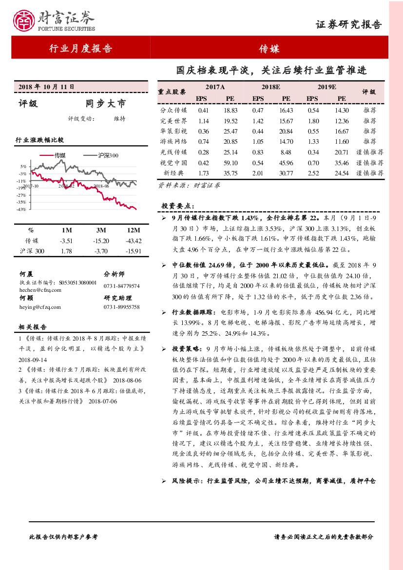 财富证券:传媒行业月度报告:国庆档表现平淡,关注后续行业监管推进.pdf