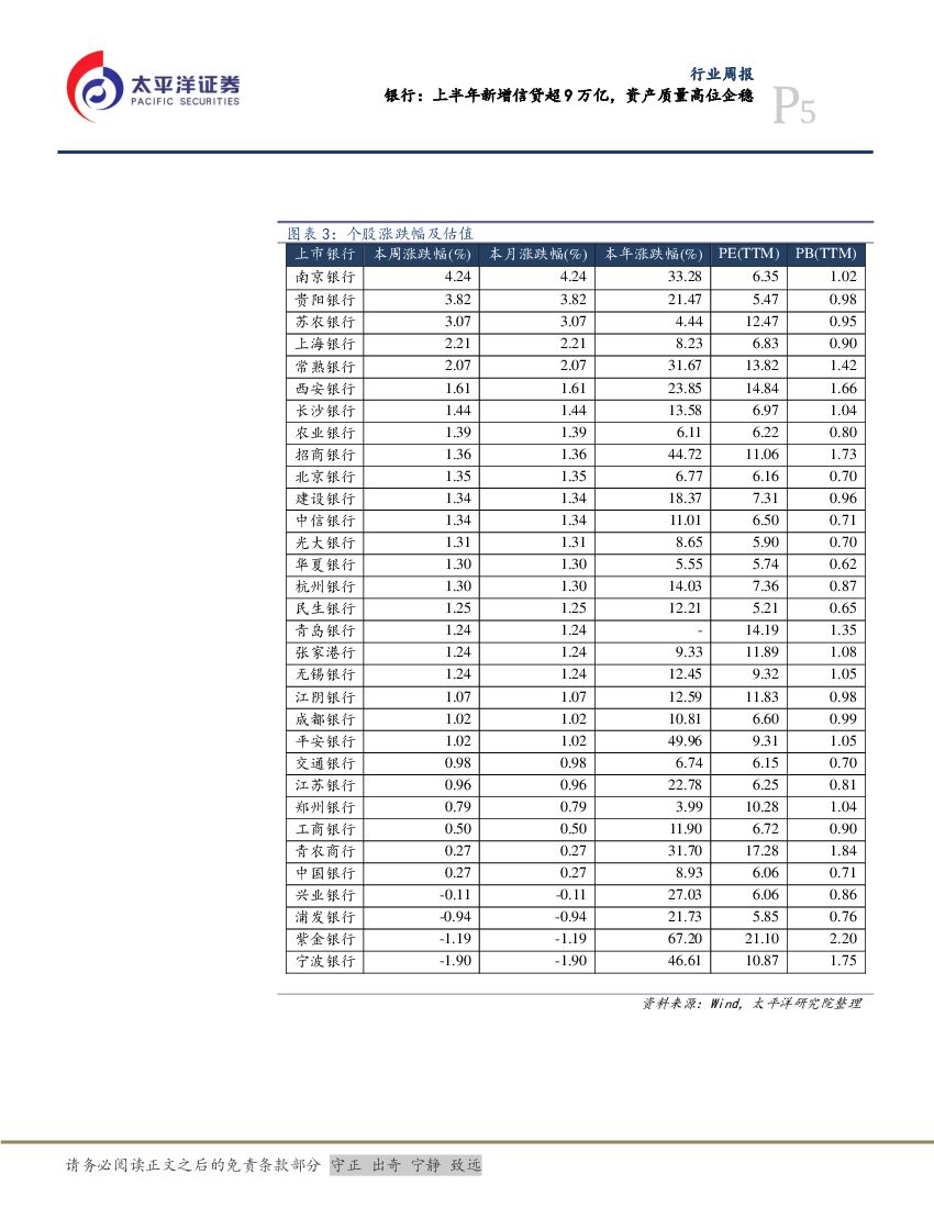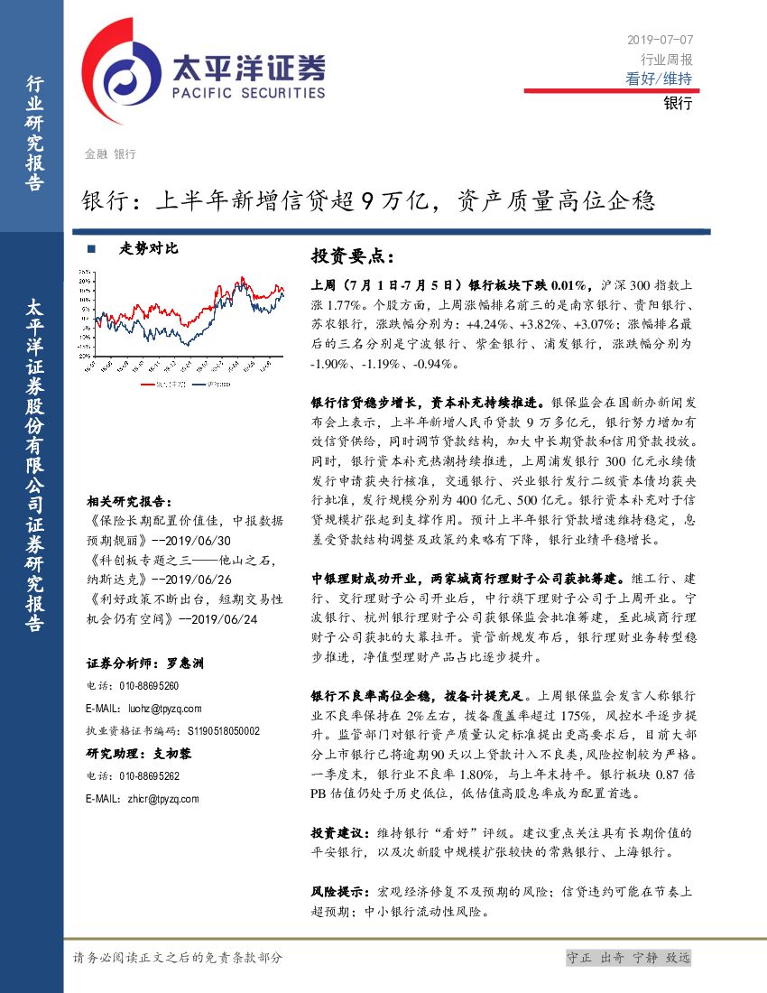 太平洋证券:银行行业周报:上半年新增信贷超9万亿,资产质量高位企稳.pdf
