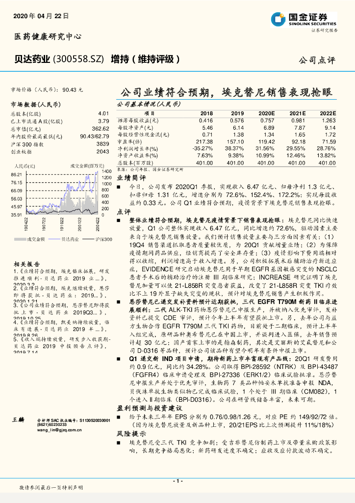 国金证券:贝达药业(300558)-公司业绩符合预期,埃克替尼销售表现抢眼.pdf