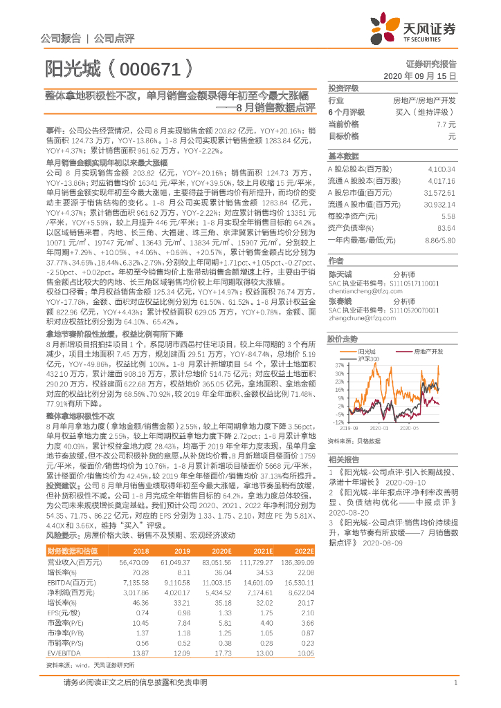 天风证券:阳光城(000671)-8月销售数据点评:整体拿地积极性不改,单月销售金额录得年初至今最大涨幅.pdf