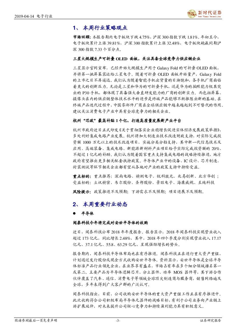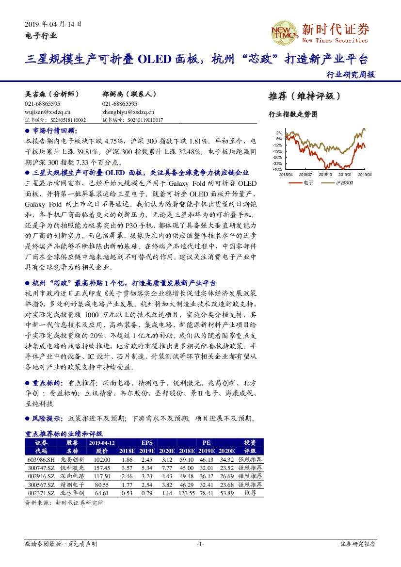 新时代证券:电子行业研究周报:三星规模生产可折叠OLED面板,杭州“芯政”打造新产业平台.pdf