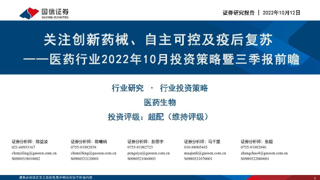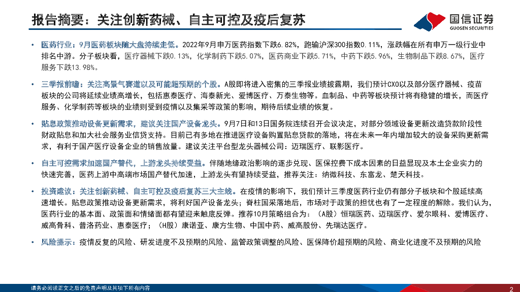 国信证券:医药行业2022年10月投资策略暨三季报前瞻:关注创新药械、自主可控及疫后复苏.pdf