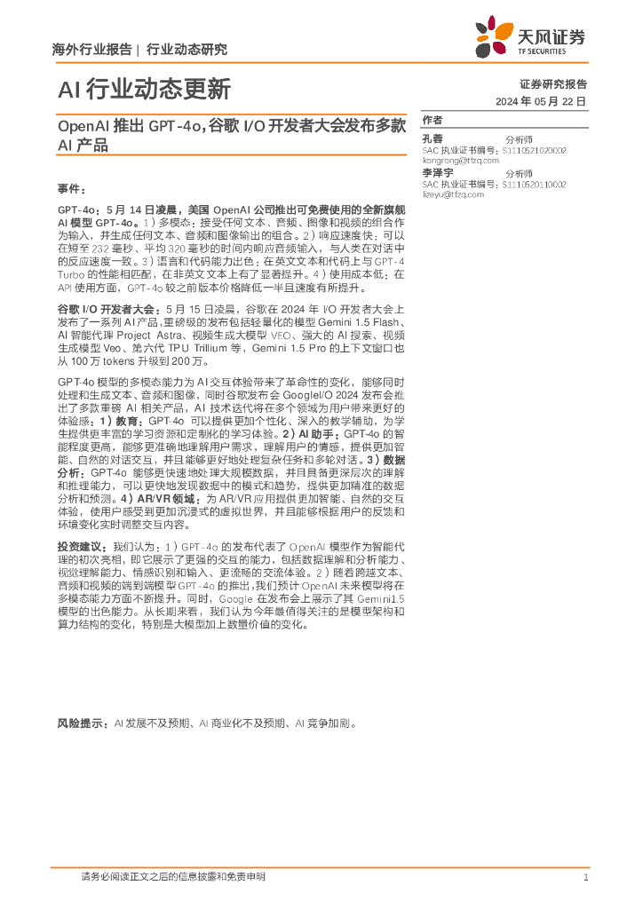 天风证券:AI行业动态更新:OpenAI推出GPT-4o,谷歌I/O开发者大会发布多款AI产品.pdf