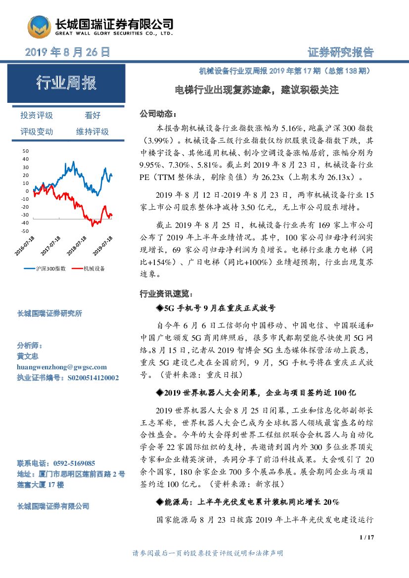 长城国瑞证券:机械设备行业双周报2019年第17期(总第138期):电梯行业出现复苏迹象,建议积极关注.pdf