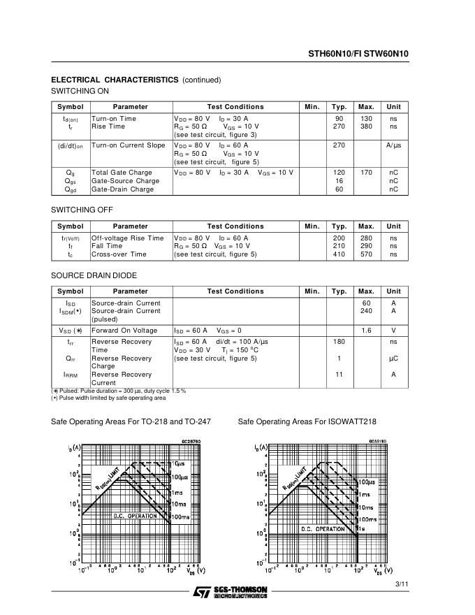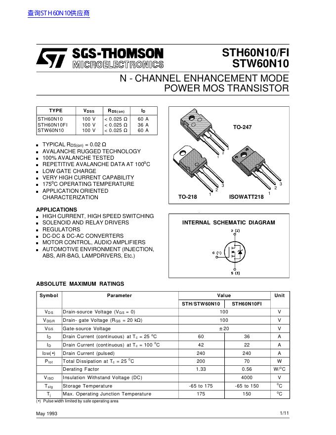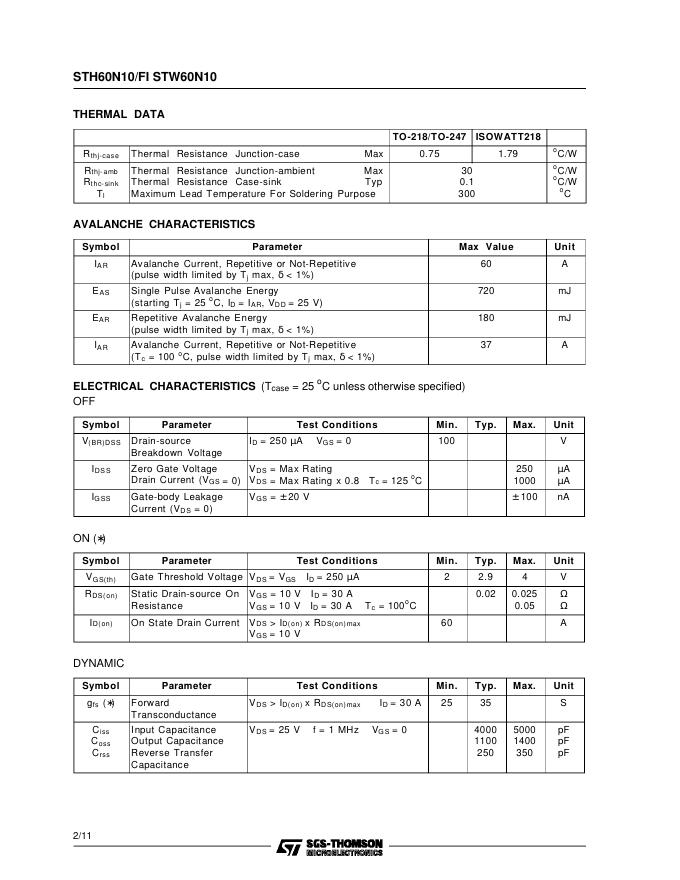 SGS-THOMSON STH60N10/FI STW60N10 N - CHANNEL ENHANCEMENT MODE POWER MOS TRANSISTOR 数据手册.pdf